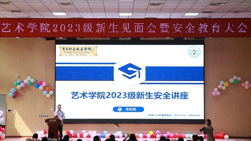 艺术学院党总支副书记郭静做迎新致辞,从独立性、思考力以及判断力等方面谈起,启发学生们要自我反思和剖析,鼓励学生们积极参加校园活动并发现生活的美好,激励学生们在新阶段、新征程上以新姿态迎接更好的自己。艺术学院副院长刘卫国代表艺术学院全体师生向2023级新生表示祝贺和热烈的欢迎,并从学院历史、专业发展沿革、双高建设重点专业、专业办学特色、师资配备实力、教学实训支持、校企合作培养等方面介绍了学院基本情况,希望2023级新生尽快适应角色的转变,勉励新生以超高的技能、宽厚的人文素养成为德才兼备、不负韶华的新青年。艺术学院安全负责人朱松岩为全体新生开展了安全教育第一课,结合生动案例详细讲解了宿舍管理、校园消防、电信诈骗等方面安全问题,为增强新生安全防范意识,守护安全有序校园生活保驾护航。