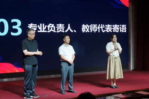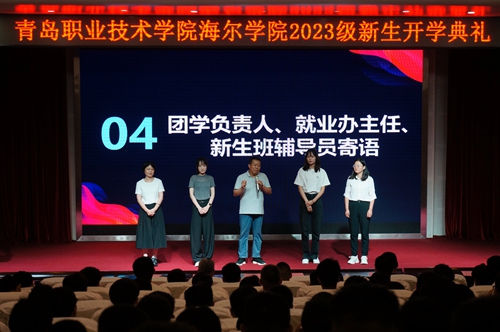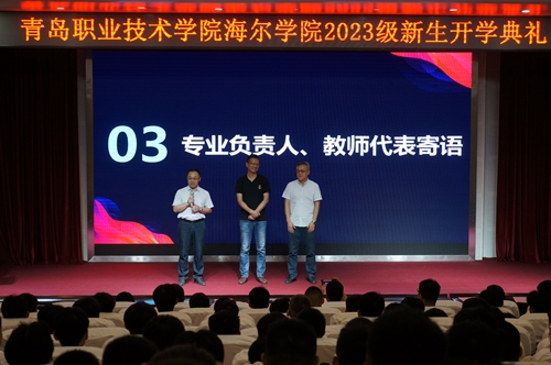 接着,各专业教研室负责人、招生就业负责人、团学工作负责人和新生辅导员上台与新生见面,大家简要介绍了专业特色、学院招生情况、负责专项工作、带班情况等,并向新生送上寄语和祝福。全国优秀教师、工业机器人教研室主任李峰教授和山东省技术能手、制冷专业教研室主任焦丽君博士作为教师代表发言,新生代表管浩、矫秀晨代表全体海尔学院2023级新生发言。