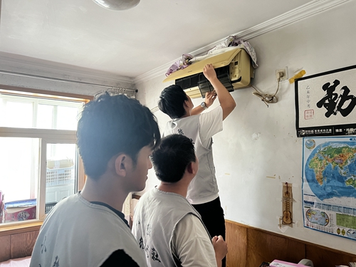 小强家电维修社与崧霖爱心社成员入户为居民检修空调