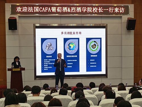 Patrick Portier介绍了CAFA葡萄酒&烈酒学院专业开设和课程设置情况,以及CAFA葡萄酒&烈酒学院毕业生的专业对口就业路径的详情。李瑞璇对学生在法国升学深造途径、毕业证书认证的权威性进行了说明,并对出国留学所需的相关语言要求和海外专升本的办法进行了介绍。