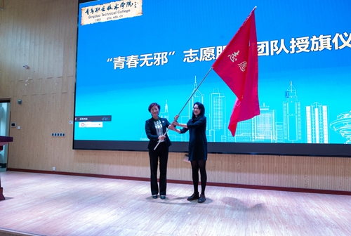 西海岸新区委教育工委委员、局党组成员、管委总督学张成霞为“青春无邪”志愿服务团队授旗
