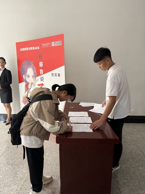 学生在反邪教警示教育宣传板签字