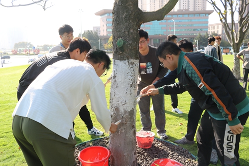学生给树木涂白漆
