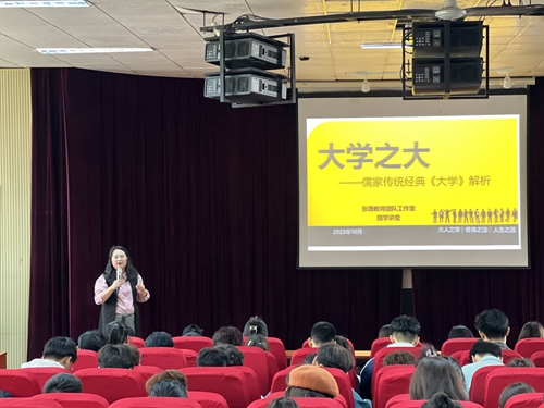 10月23日至26日,张薇教育团队工作室在艺术厅和报告厅,面向2023级新生通过解读儒家传统经典《大学》,启发大学之道。此次专题讲座以二级学院为单位共举办8场,先后共2000余名学生聆听了讲座。