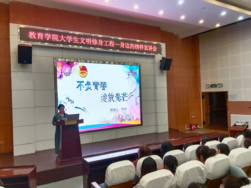 为进一步发挥优秀学生的示范带头作用,深入推进大学生文明修身工程,切实提高学生的道德修养、文明素养和职业能力,助力学生成长成才,11月1日晚,教育学院在学校报告厅开展大学生文明修身工程之“身边的榜样”事迹宣讲活动。活动由教育学院学工办负责人丁文主持。