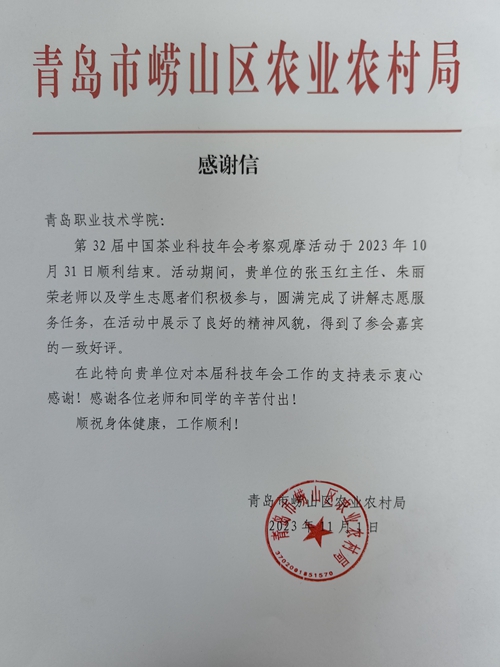 10月30日至31日,由中国茶叶学会、山东省农业农村厅、山东省农业科学院和青岛市人民政府主办,青岛市农业农村局、崂山区人民政府承办的第32届中国茶业科技年会在山东省青岛市崂山区举办。旅游学院师生积极响应盛会,充分发挥专业优势,迅速组建学生志愿讲解团,承担并圆满完成此次年会嘉宾的考察观摩活动,并收到来自青岛市崂山区农业农村局的感谢信。