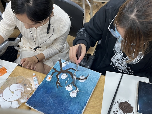 活动中,学生们通过肌理画的方式,学习二十四节气和对应的中国传统色,以此提高传统文化素养。许多学生首次接触肌理画,对新的艺术形式充满了好奇,社团负责人细心地向大家讲解绘制方法,学生们聚精会神地制作。