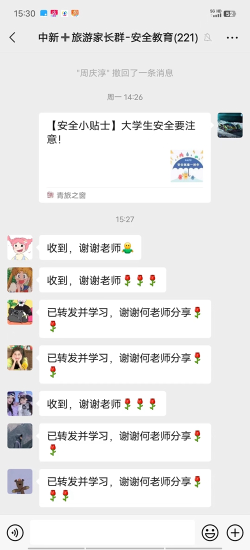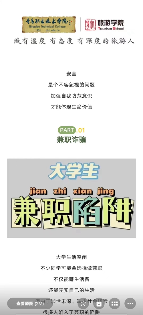 此次教育活动分为线上线下两种形式进行,将主题班会、班干部领学、学生自学、家校共育、融媒体宣传、立人书院一站式社区集中学习等形式相结合。活动中,辅导员深入班级开展了大学生兼职“陷阱”主题班会,告知学生社会兼职的风险,提高学生校外活动的防范能力,引导学生牢固树立“人人有责,安全第一”的安全观;旅游学院“青旅之窗”公众号发布大学生安全小贴士推文十余篇,帮助学生了解黑中介陷阱、网络兼职刷单陷阱、付费入职陷阱、校外交通安全等安全知识,提高学生的全方位防范意识;同时,辅导员发布安全知识到家长群,通过家校联动方式,共同帮助学生避开兼职中可能遇到的风险,提高警惕,安全兼职。各班级有效开展了形式多样的自学活动。