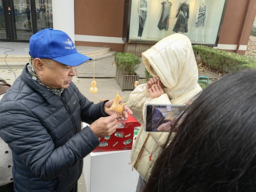 非遗传承人现场教吹糖人