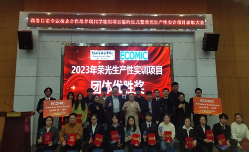 大会对在此次生产性实训项目中表现突出、成绩优异的学生进行了表彰,并颁发了获奖证书和奖品。其中,商务日语2022级1班的学生周翔宇、赵德松荣获青岛赛区优胜奖,将由荣光信息技术(青岛)有限公司出资,选派其赴荣光日本总公司及札幌地区游学一周。维多利亚vic003在此次实训项目中处理数据的总量和质量在省内6所参训院校中位列第一,荣获公司团体优胜奖。