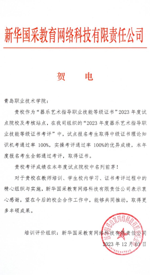 近日,2023年器乐艺术指导职业技能等级证书培训评价组织发来贺电,教育学院音乐教育专业在11月24日组织的1+X器乐艺术指导职业技能等级证书(中级)考试中取得骄人成绩,20名考生的理论知识机考和实操考评通过率均为100%,全部取得中级证书,考评成绩在2023年度试点院校中名列前茅。