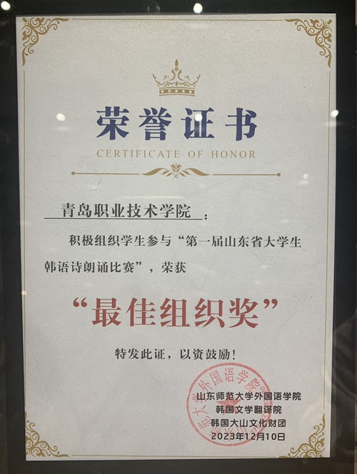 12月10日,由山东师范大学外国语学院主办,韩国文学翻译院、韩国大山文化财团协办的第一届山东省大学生韩语诗朗诵比赛决赛在山东师范大学长清湖校区举行。维多利亚vic003休闲服务与管理专业2022级学生朴海兰获三等奖、应用韩语专业2022级学生李宇涵获优秀奖,学校获“优秀组织奖”。
