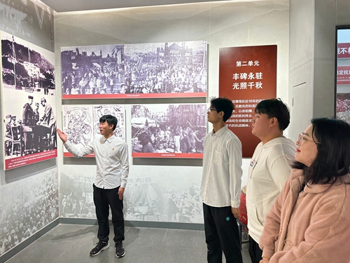“青旅红”红色文化宣讲志愿者向参观者讲解德占青岛的历史