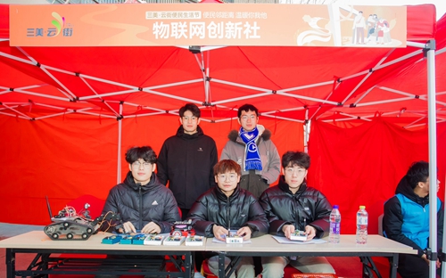 活动中,学生们协助主办方开展现场秩序维护、宣传材料发放及免费白菜发放等工作。与此同时,物联网创新社团、物联星空社团结合社团特色向社区居民进行了社团介绍并展示了具有专业特色的嵌入式小车及NB-IOT开发板,吸引了众多居民驻足观看。