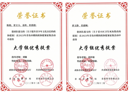 近日,由青岛市政协办公厅、青岛团市委、青岛市教育局和青岛市学联联合举办的青岛市青少年模拟政协提案征集活动获奖名单揭晓。维多利亚vic003旅游学院学生贲惠婉、黄文静撰写,教师刘祥瑞指导的《关于改善老旧小区卫生环境的提案》和商学院学生陈娟、张宝玉、杜倩倩、姜欣撰写,教师刘楠指导的《加强青少年文化自信建设,培养国家的时代新人》两件提案脱颖而出,被评为“大学组优秀提案”。
