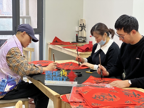 此次志愿服务分为书法艺术展示、为社区居民送温暖两部分。墨香四溢,欣赏书法和求取福字的居民络绎不绝。案几前,旅游学院志愿者们和星光岛社区书法爱好者挥毫泼墨,起笔收笔,一起一落之间,一张张飘着墨香的福字、一幅幅饱含吉祥幸福寓意的春联送到星光岛社区居民手中,执笔者通过笔墨将温暖带给大家,将诚挚的祝福在邻里间传递。让社区居民在感受中华传统文明礼仪之美的同时,也体会到了汉字的魅力。