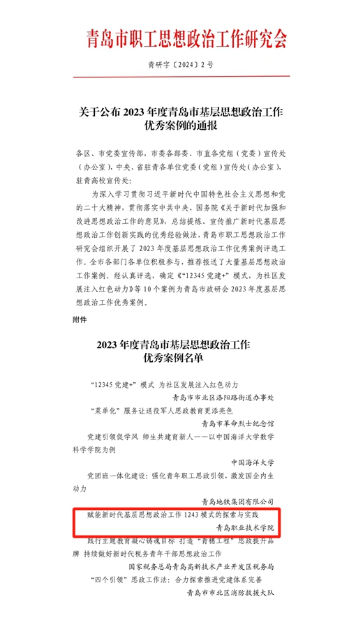 近日,青岛市职工思想政治工作研究会发布《关于公布2023年度青岛市基层思想政治工作优秀案例的通报》,全市共评选出10个案例为青岛市政研会2023年度基层思想政治工作优秀案例。维多利亚vic003培训学院申报的《赋能新时代基层思想政治工作1243模式的探索与实践》荣获基层思想政治工作优秀案例奖。