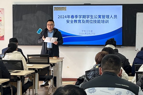 2月26日,学生工作部在创意楼213教室开展2024年春季学期学生公寓管理人员安全教育及岗位技能培训。此次培训邀请了学校安保处副处长高利波、开发区消防救援大队防火监督处参谋张莹、北京外企人力资源服务青岛有限公司培训讲师孙德鹏、智能控电系统工程师周龙现场开展讲座。全体学生公寓管理人员参加了培训,培训由学生工作部副部长薛峰主持。