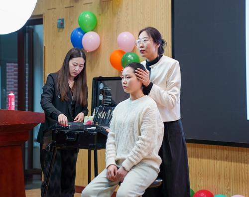 活动中,王春言结合自身丰富的经验,为大家讲解了基本的化妆技巧、护肤知识以及如何根据个人特点选择合适的妆容。她还通过现场示范,让参与者更直观地了解化妆的技巧和方法。在互动环节中,王春言通过一对一指导化妆的形式,耐心解答了女教职工提出的各种问题。