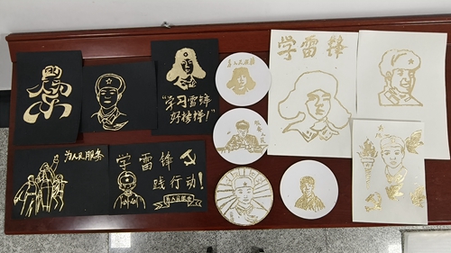 活动首先由“青之印”志愿宣讲员围绕雷锋精神的时代内涵、永恒价值以及如何践行雷锋精神等方面展开宣讲,带领学生们深入学习雷锋全心全意为人民服务的宗旨、忠诚于革命和党的信仰,以及甘愿做一颗小小螺丝钉的平凡而伟大的精神。随后,宣讲员详细介绍了非物质文化金箔画的历史文化和工艺传统,现场重点示范了手绘、点胶水、贴金等重要工序,方便大家学习金箔贴附技巧,感受传统技艺的乐趣与魅力。活动体验环节,学生们发挥绘画专长,以铭刻雷锋形象为主题和灵感进行金箔画创作,大家有条不紊地刷胶、铺金箔、清扫,以艺术之手对心中全心全意为人民服务的楷模加以描摹、歌颂与缅怀。一画,一贴,一扫,便呈现出形象生动的卡通雷锋、挺拔刚毅的雷锋肖像以及雷锋无私助人的场景,通过一幅幅熠熠生辉的“金箔画”将雷锋精神与艺术创作巧妙的碰撞。