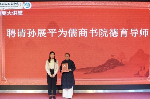 商学院党总支副书记魏敏敏为孙展平颁发儒商书院德育导师聘书