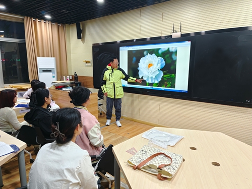 活动中,王泽辉把自己刚参加洛阳、菏泽牡丹花会的照片与学生们一一分享。相册中不同类别、形态、色彩的牡丹花,使得整个工作室仿佛置于千姿百态、五颜六色的牡丹花海之中,使学生们感受到了国色天香的魅力所在。大家激情迸发、集思广益,开始在纸上创作自己心目中的牡丹花。经过不懈努力,绘有一朵朵栩栩如生牡丹的团扇呈现在每个人的眼前。