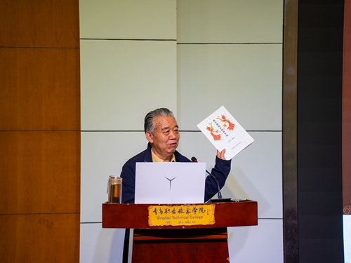 王祥云是文旅部艺术发展中心全国美术考级委员会委员,国家艺术品鉴定评估师(高级),非物质文化遗产项目鸟虫篆代表性传承人,郑州大学汉字文明研究中心兼职教授。他结合自己的研究和实践,为师生作了“青岛东夷文化与鸟虫篆的传承”主题讲座,深入浅出地解读了青岛东夷文化与鸟虫篆的传承,让现场师生深刻感受到中华优秀传统文化的独特魅力和深远影响。