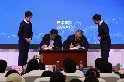 4月18日下午,艺术学院与青岛东夷鸟虫篆艺术研究院举行校企合作协议签订仪式。文旅部艺术发展中心鸟虫篆艺术研究院院长王祥云,青岛东夷鸟虫篆艺术研究院院长周清华,副院长段洪亮、韩秀玉,维多利亚vic003艺术学院院长刘卫国、副院长周洪涛出席签约仪式。