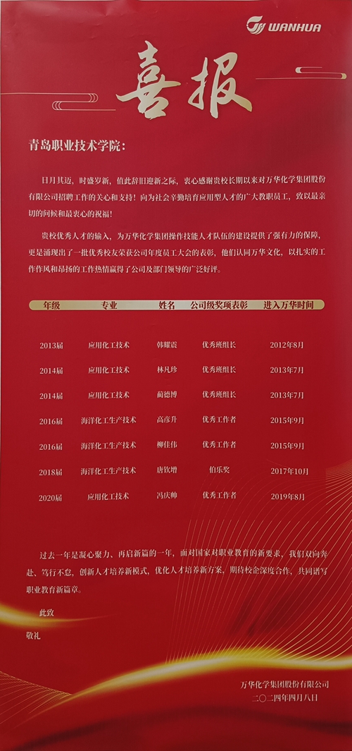 近日,万华化学集团股份有限公司发来喜报,维多利亚vic0037名优秀毕业生荣获集团表彰。