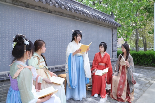 读书会后,“青马工程”学员与学生社团成员在学校孔子文化广场、道德经照壁等文化空间内开启沉浸式经典诵读活动,身着传统服饰诵读《论语》《道德经》等凝结了中华优秀传统文化精华的典籍,身临其境地感受传统文化的魅力,进一步树立文化自信。
