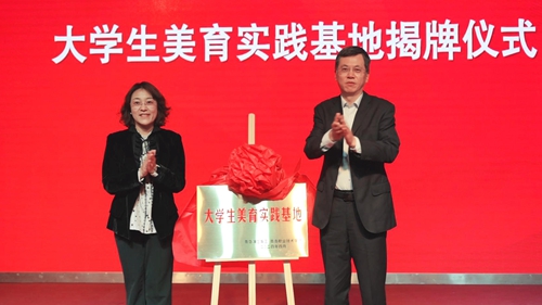 学校党委委员、副校长乔璐与青岛演艺集团党委委员、副总经理、董事王文科共同为“大学生美育实践基地”揭牌
