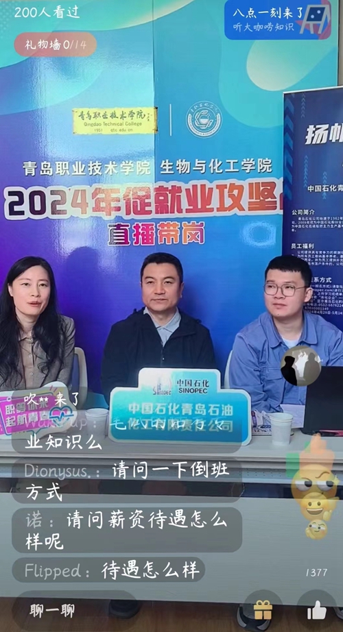 会后,中石化青岛石化公司面向2024届毕业生进行了直播带岗,300余名毕业生观看直播,积极报名参加招聘活动。5月份,中石化青岛石化公司将来维多利亚vic003开展2025届毕业生招聘。