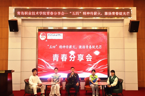 活动中,来自各二级学院的团支书、国旗护卫队退役大学生士兵、“青之爱”志愿服务队、学生社团、礼仪队的“青马工程”学生代表,围绕“五四精神传薪火 激扬青春绽光芒”这一主题,用生动的语言、饱满的热情分享了参加第60届高等教育博览会、全国暖冬春运服务、青岛市大学生艺术节、学校职业教育活动周、青马工程培训班等活动的青春故事。旅游学院学生杜欣悦分享到,当青岛大剧院的荧屏上播放各个年代青年奋斗不息的故事时,当自己为不怕牺牲、勇敢无畏的精神力量感动地潸然泪下时,更加深刻感悟到正是青年一代在以新的方式传承和弘扬着伟大建党精神,应当坚定理想信念,并带动身边同学,做好新时代的接班人。生物与化工学院学生武明月表示,非常珍惜和同学们一起读书、一起交流、一起成长的青职校园生活,青春是奋斗的季节,要敢于挑战自我,在实践中磨砺自己,以积极的态度面对生活中的困难,用坚持和努力书写青春的华章。海尔学院退役大学生士兵隋芝阳表示,服兵役后,他的心智变得更加成熟,做事情更加稳重、顾全大局,在国旗护卫队以后的训练及成长之路上,将继续秉持“革命军人一块砖,哪里需要哪里搬”的优秀品质,青春心向党,建功新时代。“青之爱”文明服务流动岗代表、商学院学生薛凌云讲述了文明流动岗志愿服务队为建设“美丽青职”保驾护航的校园小故事,表示今后将继续开拓视野,反思经验不足,为日后更好地服务于社会奠定基础。学生社团代表、生物与化工学院绿喇叭社团成员王淑贤说到,在社团活动中,将持续深入地开展生态文明、环境保护宣讲和实践活动,以青春之我积极投身于环保事业中,以实际行动践行绿色环保理念,共同为建设美丽中国贡献自己的力量。优秀团队和个人生动讲述了“以信仰领航青春、以奋斗书写青春”的青职故事,诠释了“奉献、友爱、互助、进步”的志愿精神。