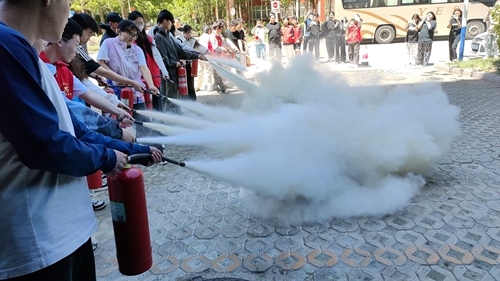 疏散演练结束后,开发区江山路消防救援站队长王松龄对疏散演练过程进行了讲评,普及了应急疏散和消防知识,强调了公寓住宿安全需注意的事项;安保处职员吴章建进行了灭火器使用方法演示,近百名师生现场参与灭火演练。