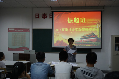 9月22日晚,振超班2015年夏季学期社会实践答辩会在致用楼举行。振超班全体同学一一上台,用PPT的形式展示自己的社会实践成果,与大家分享社会实践的感受和体会。海尔学院党总支书记费晓玉、团总支书记马雪参加答辩会并担任评委。