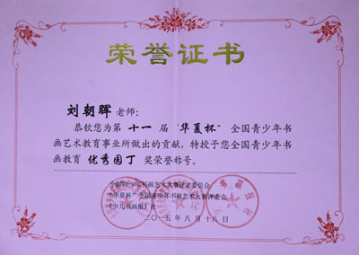 “华夏杯”全国青少年书画大赛青年组的书法比赛由全国青少年书画艺术大赛评委会、少年儿童书画协会、少儿书画报社联合举办,全国包括海外共有300多家单位,近3万名学生参加比赛。我院指导教师刘朝晖多年来一直从事公选课《楷书书法柳体》和《行书》教学,培养了大批书法爱好者,此次获奖是公选课教学成果的体现。
