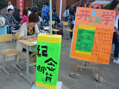 迎新当天,教育学院为等候在报到处外面的家长设置纪念邮筒。请爸妈们将对孩子的期望,自己的感慨,说不出口的祝福与不舍写在明信片上,教育学院将会送到学生手中。亲情永远是最值得感恩的。