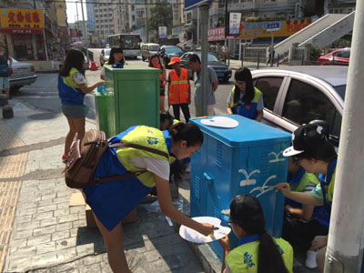 8月29日,教育学院美工社成员在市区内进行“创卫”志愿服务活动。此次活动由青岛市青年志愿者协会联合青岛市城市管理局团委组织,旨在组织广大青年志愿者通过清理小广告、彩绘墙体、书写宣传标语等,参与市区服务,改善市区环境,为“青岛市创建国家卫生城市”添油助力。教育学院20名学生参与了活动。 活动中,学生们通过自己手中的画笔,在街头的电箱上描绘各种装饰图案,通过自己的实际行动让城市展露新颜,做文明的传播者,把“家”装扮得更加美好。