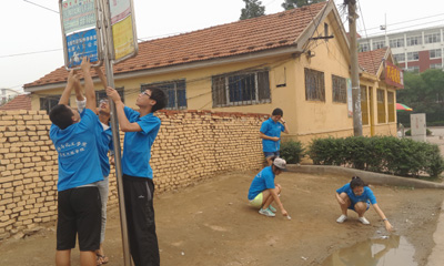 同学们在擦洗公交站牌