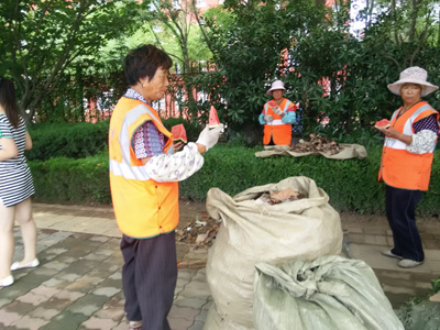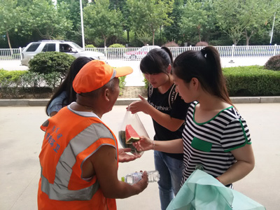 志愿者们在步行中都已感到天气的炎热,更加体会到环卫工人顶着酷暑工作的辛苦。为了帮助这些“马路美容师”降暑,志愿者们带着西瓜和矿泉水沿街送给他们。同学们还主动帮助环卫工人清扫道路上和绿化带里的垃圾,并嘱托他们劳逸结合,注意身体,防止中暑。