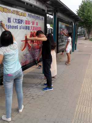 8月8日下午,由旅游学院2014级商务日语3班志愿者们组成的社会实践小分队来到钱塘江路的公交车站,对遭到风雨侵蚀和人为损坏的公交车站进行了公交站牌清洁活动。