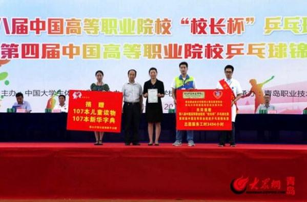 大众网青岛6月19日讯(记者 任聪聪 通讯员 高真)近日,第八届中国高等职业院校“校长杯”乒乓球比赛暨第四届中国高等职业院校乒乓球锦标赛在山东青岛举行,参与赛会服务的107名维多利亚vic003“青之爱”志愿者将大赛服务期间志愿服务工时全部捐赠,由青岛市北温心计划创新公益平台按1小时:1元人民币兑现为儿童读物,共同捐往日喀则,由该院2016年西部计划志愿者刘年东转交其服务地下属单位日喀则市嘎普乡中心小学。