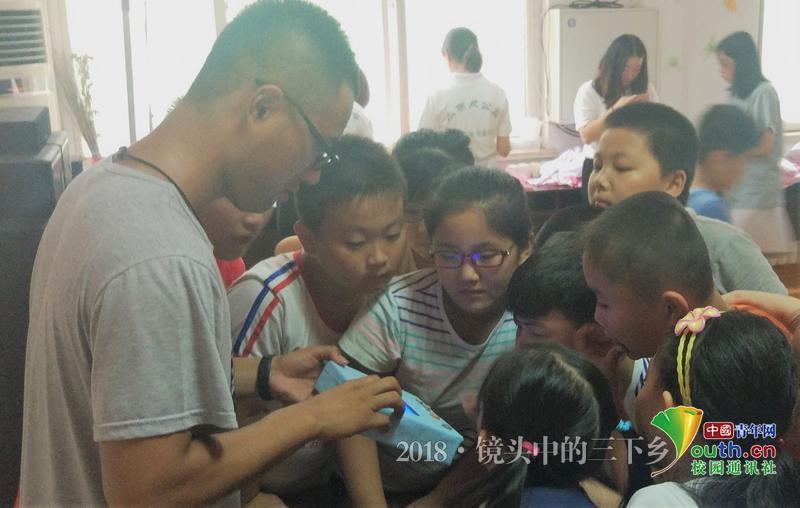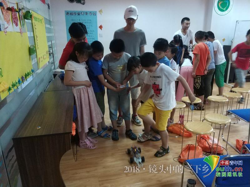 实践队成员一来到 “青桐学堂”教室,孩子们就被他们手上的科研作品吸引,纷纷围上前来,你一言我一语好奇的询问。中国青年网通讯员 张天梓 摄