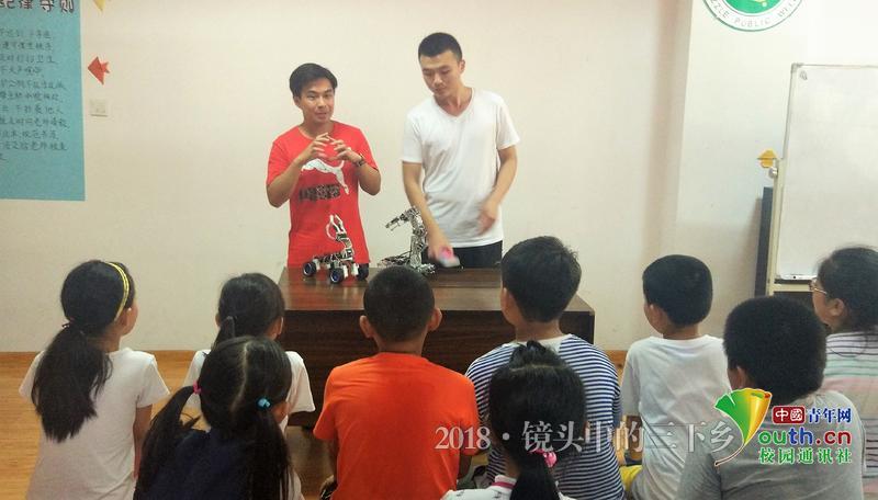 实践队成员先以通俗易懂的讲解方式耐心向小朋友们介绍科研作品所蕴含的科学原理,并简单介绍了科研产品各个部分的具体功能。中国青年网通讯员 张天梓 摄