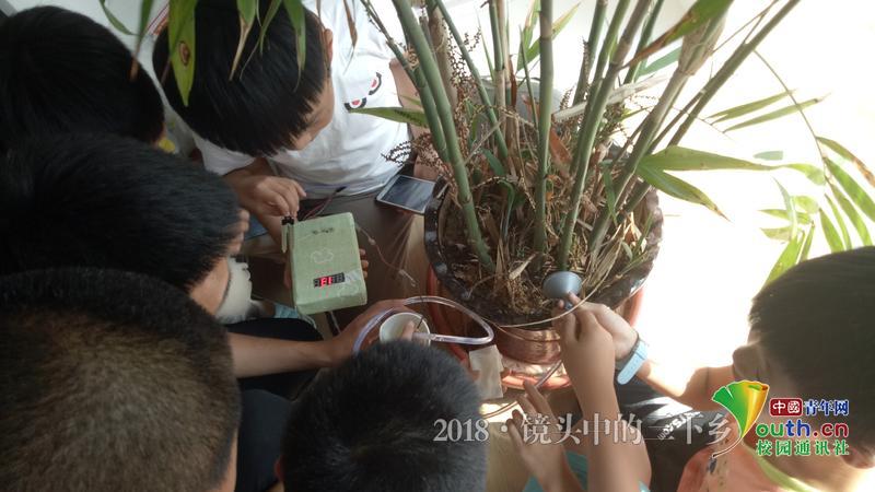 小朋友们自主操作自动浇花机,尽情体验科学研究、科技开发的乐趣,通过动手、动脑,从娱乐中感受科技的魅力。中国青年网通讯员 张天梓 摄