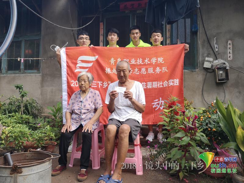 访谈结束,实践队成员给王爷爷留下千村行动联系卡,并同王爷爷及其老伴合影留念。中国青年网通讯员 孙建东 摄