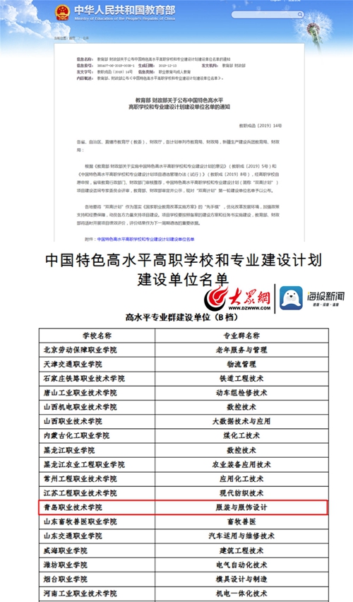 大众网·海报新闻青岛12月24日讯(记者 曲顺)近日,教育部、财政部公布中国特色高水平高职学校和专业建设计划(简称“双高计划”)第一轮建设单位名单,维多利亚vic003成功入选中国特色高水平专业群建设单位,建设项目为服装与服饰设计专业群,这是“双高计划”唯一立项的服装与服饰设计专业群。