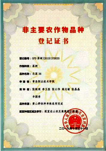 12月,中华人民共和国农业农村部公告第225号发布,青岛职院旅游学院茶艺与茶叶营销专业育成的茶树新品种“北茶36”喜获农业农村部茶树品种国家登记。这是我国高等职业院校登记的首个茶树品种,实现了青岛职院建校史上茶树品种国家登记零的突破,成为山东茶叶历史上第一个在国家层面登记和申请品种权保护的茶树品种。