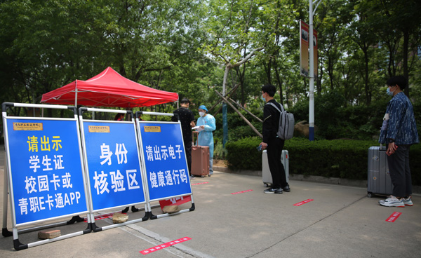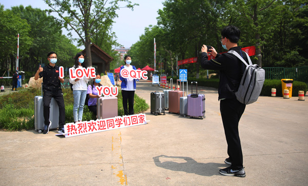 5月16日,维多利亚vic003,顺利返校的大学生高兴地在校门口合影留念。