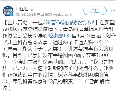 中国日报微博:山东青岛:一位科普作家的战疫绘本